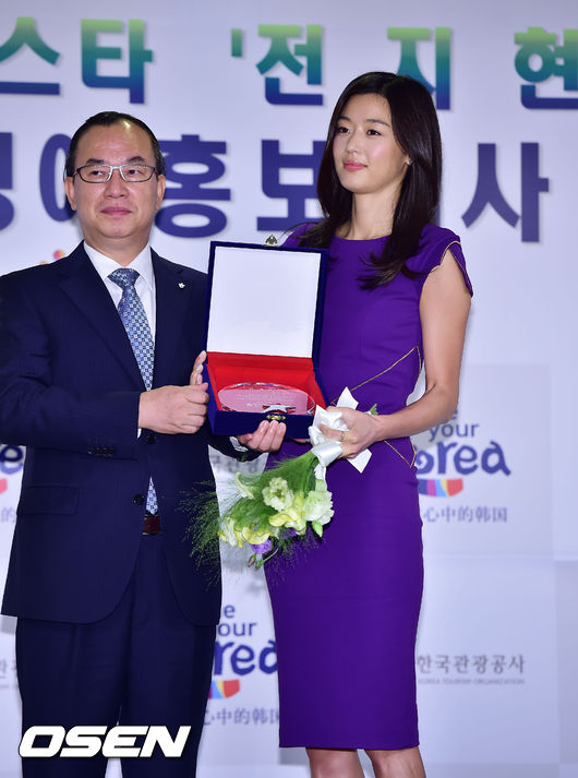 12일 오전 서울시 중구 한국관광공사에서 진행된 배우 전지현의 한국관광공사 명예홍보대사 위촉식에서, 전지현이 한국관광공사 사장 변추석과 함께 포토타임을 갖고 있다.