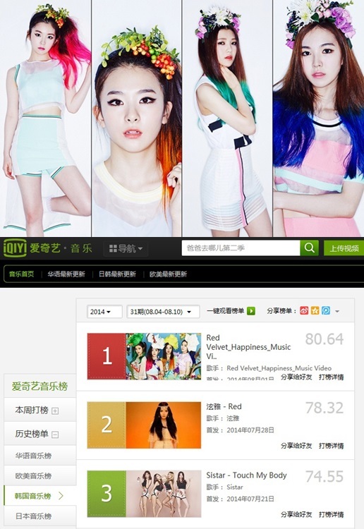 레드벨벳의 데뷔곡 ‘행복’ 뮤직비디오는 중국 온라인 동영상 사이트 아이치이(愛奇藝)의 뮤직비디오 주간차트(8월 4일~8월 10일) 한국어 부문 1위에 올랐다.