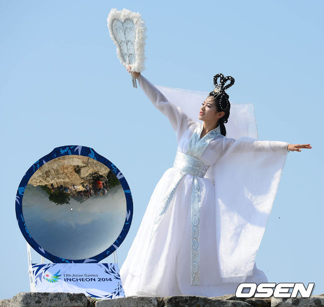 12일 오후 인천 강화군 마니산 참성단에서 열린 2014 인천 아시아 경기대회 성화채화 행사에서 선녀가 채화경 앞에서 춤사위를 선보이고 있다.