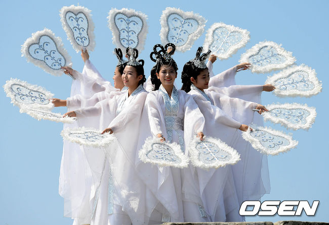 12일 오후 인천 강화군 마니산 참성단에서 열린 2014 인천 아시아 경기대회 성화채화 행사에서 칠선녀들이 춤사위를 선보이고 있다.