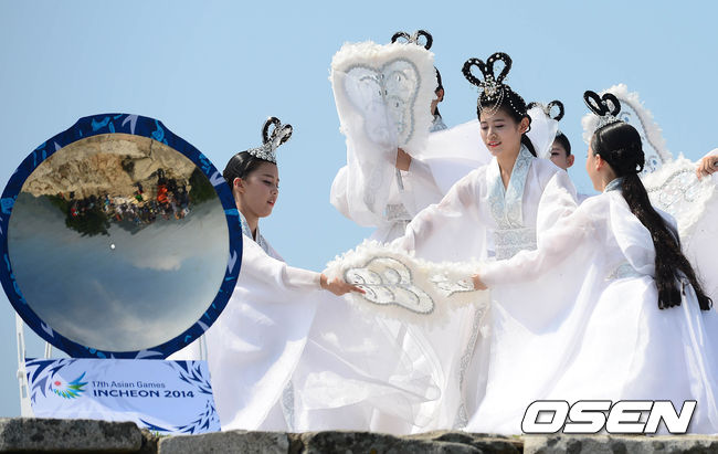 12일 오후 인천 강화군 마니산 참성단에서 열린 2014 인천 아시아 경기대회 성화채화 행사에서 칠선녀들이 성화 채화 의식을 하고 있다.