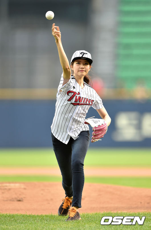 경기에 앞서 2014 미스코리아 진 김서연이 시구를 하고 있다.