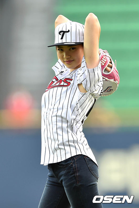 경기에 앞서 2014 미스코리아 진 김서연이 시구를 하고 있다.