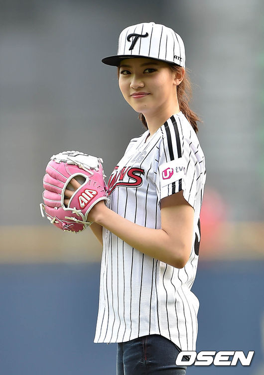 경기에 앞서 2014 미스코리아 진 김서연이 시구를 하고 있다.