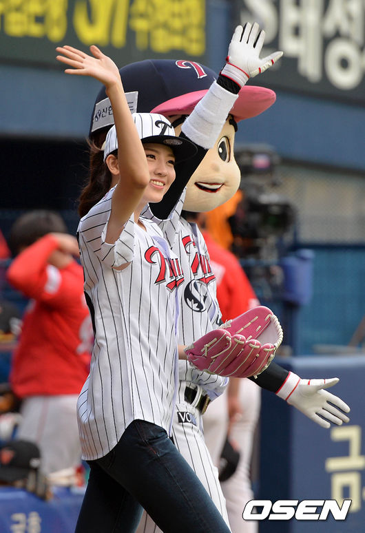 경기에 앞서 2014 미스코리아 진 김서연이 그라운드로 입장하며 관중석을 향해 인사를 하고 있다.