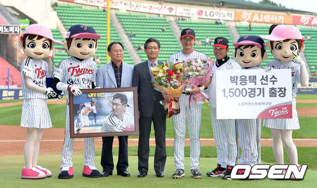경기에 앞서 통산 1,500경기 출장 기념 시상식을 가진 LG 박용택이 기념촬영을 하고 있다.