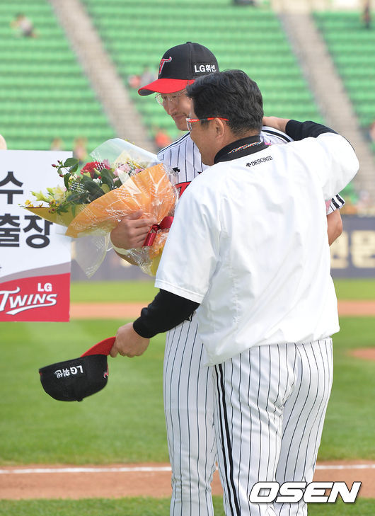 경기에 앞서 통산 1,500경기 출장 기념 시상식을 가진 LG 박용택이 양상문 감독으로부터 꽃다발을 받고 있다.