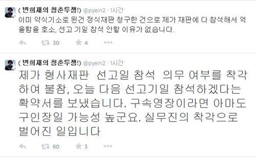 이와 관련해 변희재 대표는 검찰 불출석에 대한 문제를 SNS를 통해 사과했다. 변희재 대표는 12일 오후 자신의 트위터에 "어쨌든 대한민국 국민으로서 당연히 출석해야 할 선고기일에 출석을 못해 물의를 일으킨 부분에 대해 법원, 검찰, 애국동지들 및 독자들에 사과드립니다"라는 글을 게재했다.