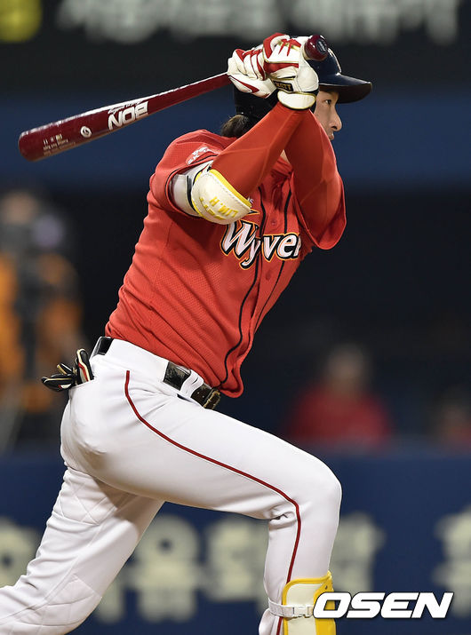 3회초 2사 만루에서 SK 임훈이 우전 2타점 적시타를 치고 있다.