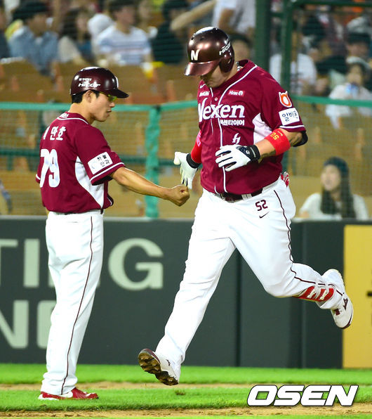 3회초 솔로포를 날린 박병호가 최만호 코치와 기쁨의 하이파이브를 나누고 있다.