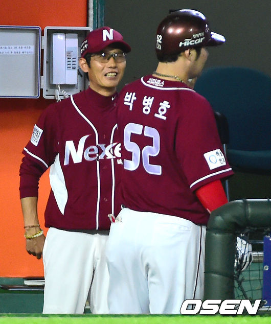 3회초 솔로포를 날린 박병호가 덕아웃에서 염경엽 감독과 인사를 나누고 있다.