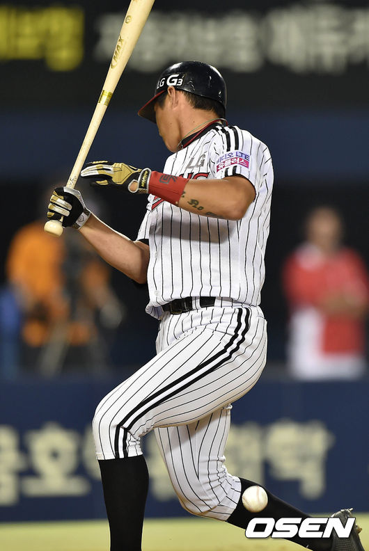 3회말 무사 1루에서 LG 오지환이 SK 박민호의 투구를 맞고 있다.