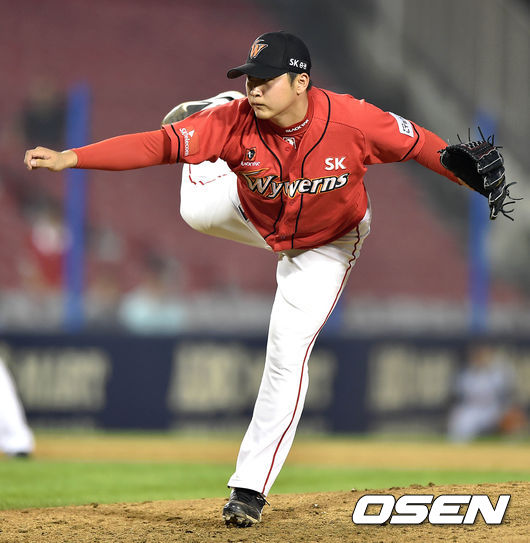 3회말 무사에서 SK 박민호가 힘차게 공을 던지고 있다.