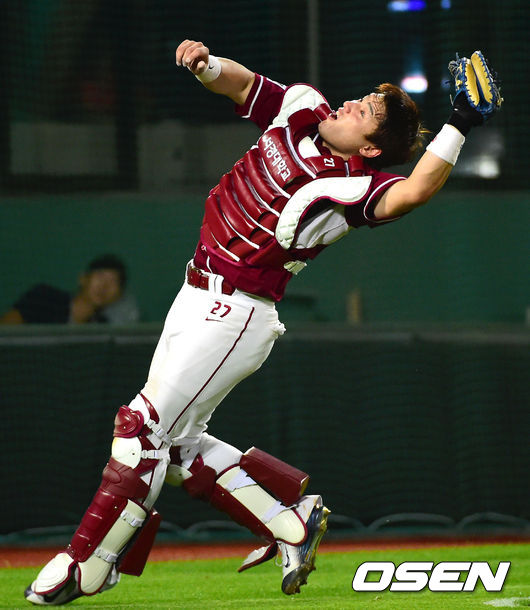 4회말 무사 주자없는상황 넥센 박동원이 파울타구를 잡아내고 있다.