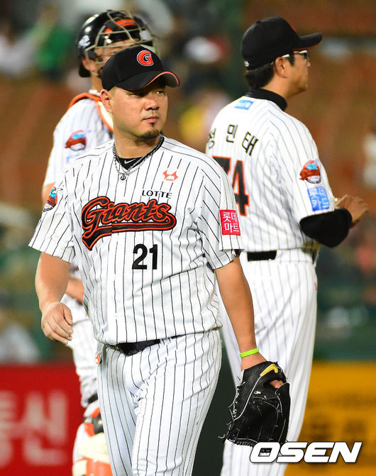 5회초 무사 1루 롯데 선발 송승준이 마운드를 내려가고 있다.