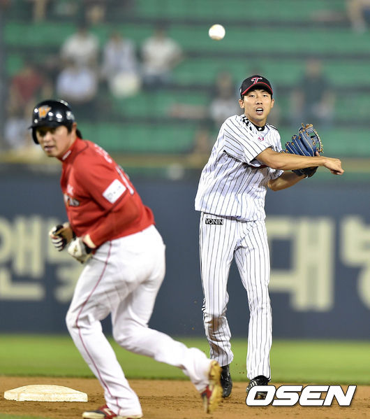 7회초 1사 1루에서 LG 김용의가 SK 이명기를 병살타로 처리하고 있다.