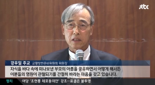 한국천주교 주교회의 의장 강우일 주교는 12일 “방한하는 프란치스코 교종(교황)은 어려움을 겪고 있는 우리에게 하느님의 사랑과 희망을 선포할 것”이라며 “눈물을 흘리는 사람들을 내쫓을 순 없다”고 말해 시복식 장소인 광화문광장에서 농성 중인 세월호 희생자 가족에 대한 강제퇴거 반대 입장을 밝혔다.