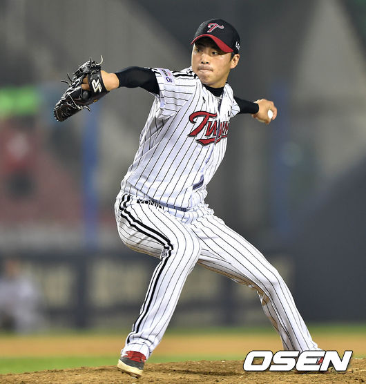 9회초 LG 윤지웅이 힘차게 공을 던지고 있다.