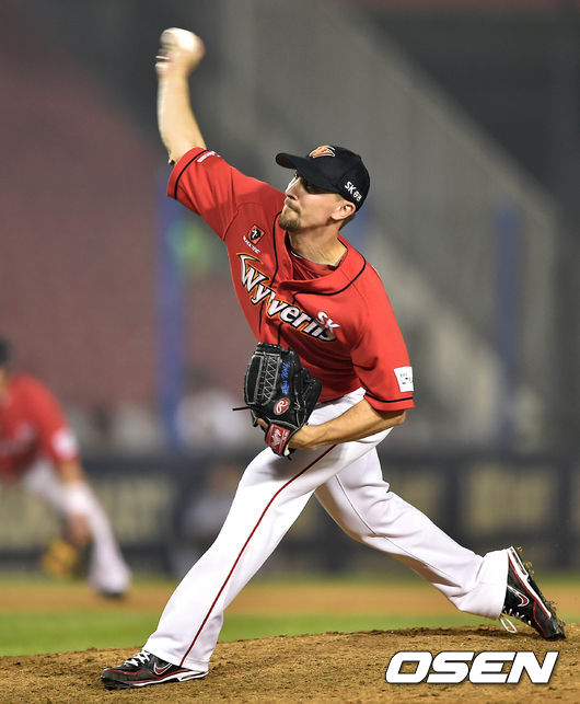 9회말 SK 울프가 힘차게 공을 던지고 있다.