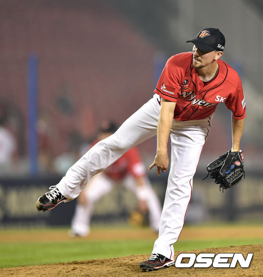 9회말 SK 울프가 힘차게 공을 던지고 있다.