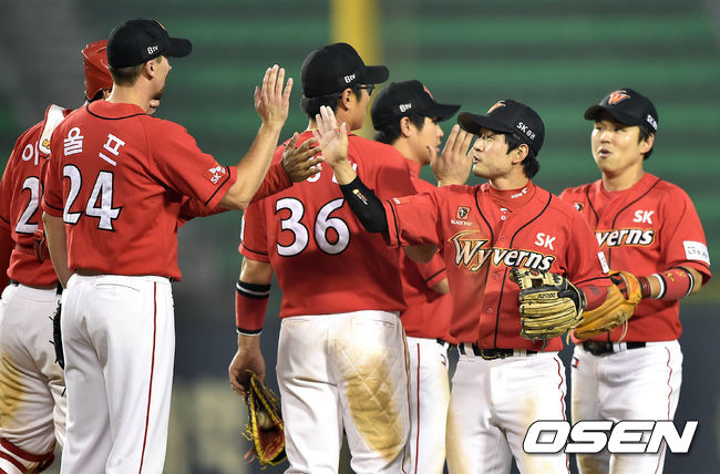 경기 종료 후 SK 선수들이 승리의 기쁨을 나누고 있다. /sunday@osen.co.kr