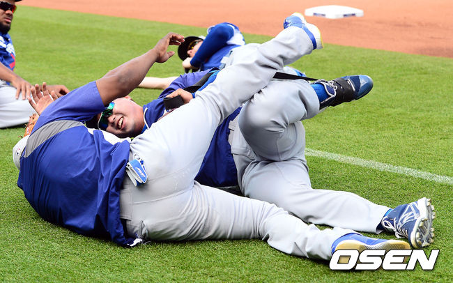 13일 (이하 한국시간) 미국 조지아 애틀랜타 터너필드에서 '2014 메이저리그' 애틀랜타 브레이브스와 LA 다저스의 경기에 앞서 다저스 유리베가 류현진에게 장난을 치고 있다.