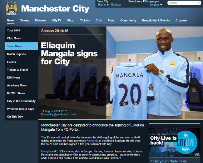 맨시티는 이번 시즌 수비 보강을 위해 망갈라의 영입을 위한 적극적인 움직임을 보였다. 결국 포르투와 협상 끝에 이적료로 3200만 파운드(약 552억 원)를 제시하고 망갈라의 영입을 확정지을 수 있었다. 하지만 망갈라가 즉시 투입되는 것은 무리일 것으로 보인다. 2014 브라질 월드컵을 출전하고 휴식을 취했던 망갈라가 아직은 몸상태가 완벽하지 않다고 말했기 때문이다.