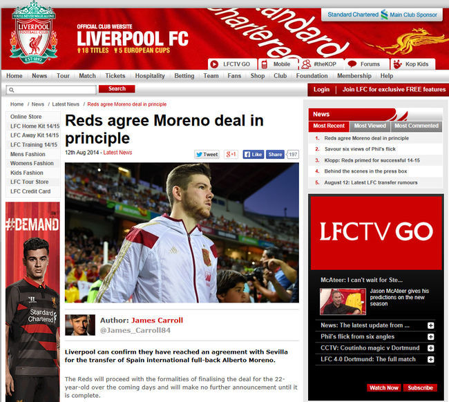 리버풀이 왼쪽 측면 수비를 보강할 것으로 보인다. 리버풀은 13일(이하 한국시간) "세비야의 왼쪽 측면 수비수 모레노의 이적에 합의했다"고 전했다. 리버풀은 이적료에 대해 구체적인 언급을 하지 않았지만, 영국의 스포츠 전문 매체 '스카이스포츠'는 1200만 파운드(약 207억 원)로 추정했다.