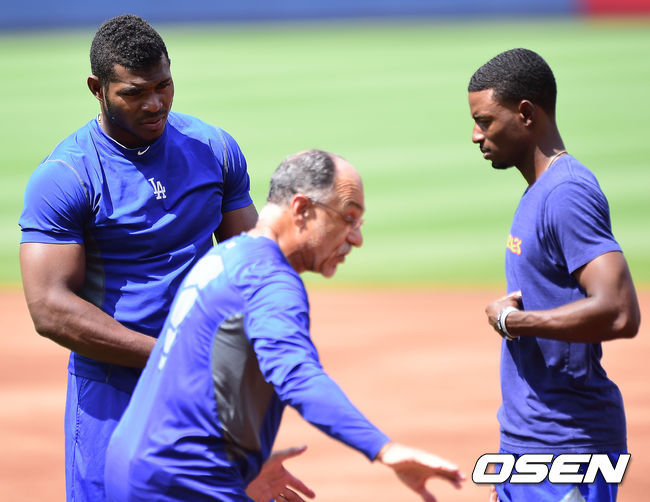 13일 (이하 한국시간) 미국 조지아 애틀랜타 터너필드에서 '2014 메이저리그' 애틀랜타 브레이브스와 LA 다저스의 경기에 앞서 다저스 푸이그가 로페스 코치와 디 고든에게 주루 훈련을 받고 있다.