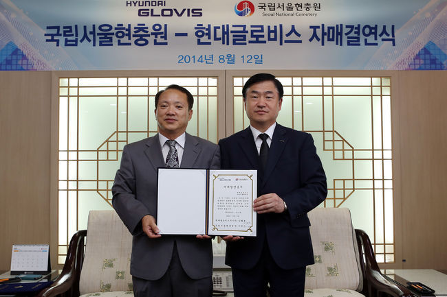 김형호 현대글로비스 물류사업본부장(부사장)은 12일 오후 서울 동작구 국립서울현충원 현충문 귀빈실에서 이선근 현충원 원장을 만나 현대글로비스 임직원들이 제 37묘역 총 842 위를 가꾸는 봉사와 헌화활동을 펼치기로 약속했다.