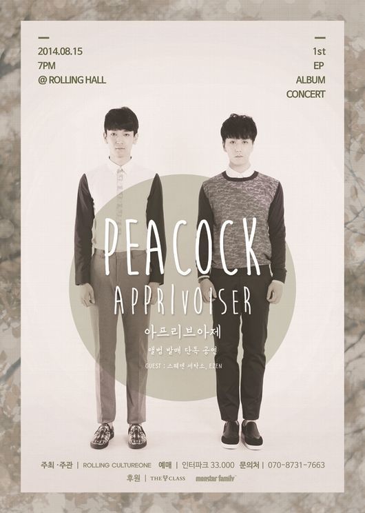 피콕은 지난 7월 16일 첫 데뷔 EP앨범 '아프리브아제(apprivoiser)'를 발표한지 한 달 만인 오는 15일 단독콘서트를 개최하며 공연장의 전면과 좌우 측면을 이용한 영상 연출을 선보일 예정이다.