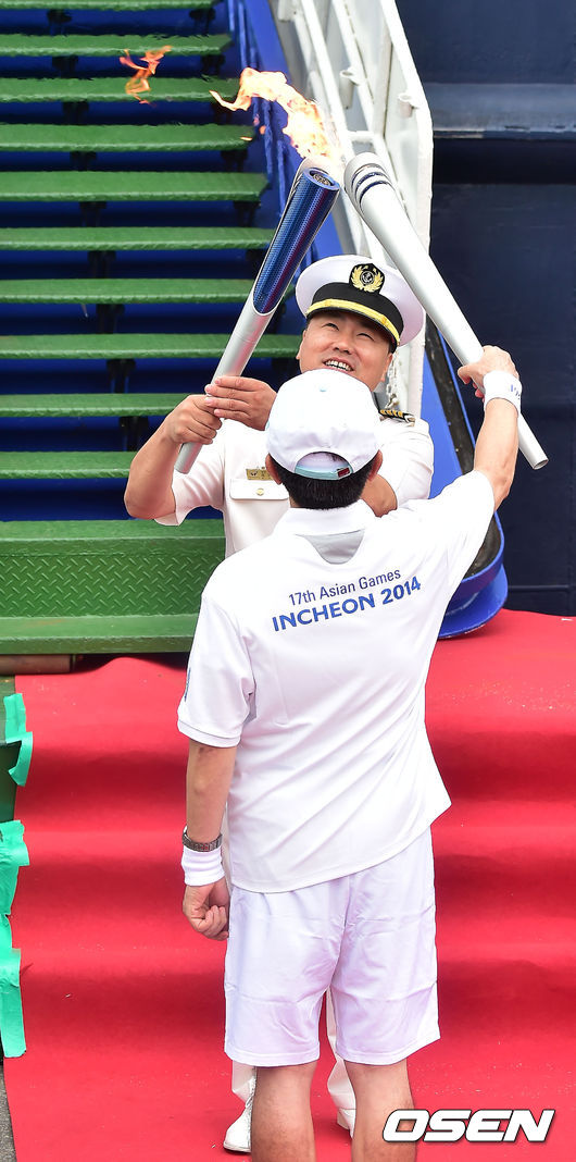 13일 오전 인천 중구 항동7가 인천항 제1부두에서 진행된 2014 인천 아시아 경기대회 해외 성화도착 환영식, 성화를 든 고경남 뉴골든브릿지 2호 선장이 최장현 위동항운사장에게 성화를 전달하고 있다.