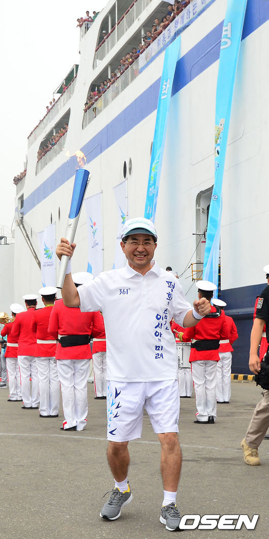 13일 오전 인천 중구 항동7가 인천항 제1부두에서 진행된 2014 인천 아시아 경기대회 해외 성화도착 환영식, 해외 성화를 최장현 위동항운사장이 성화를 들고 달리고 있다.