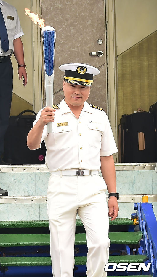 13일 오전 인천 중구 항동7가 인천항 제1부두에서 진행된 2014 인천 아시아 경기대회 해외 성화도착 환영식에서 고경남 뉴골든브릿지 2호 선장이 성화를 들고 배에서 내리고 있다.