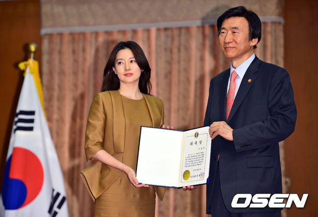 13일 서울 종로구 외교부 청사에서 진행된 이영애의 2014 한-아세안 특별정상회의 홍보대사에서 배우 이영애가 윤병세 외교부장관과 포즈를 취하고 있다