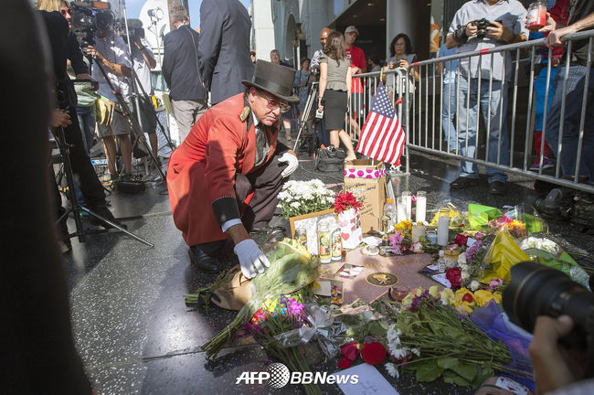 [OSEN=사진팀] 할리우드 유명 배우 로빈 윌리엄스가 향년 63세의 나이로 사망한 가운데 12일(현지시간) 미국 캘리포니아 할리우드에서 수많은 시민들이 애도를 하고 있다.