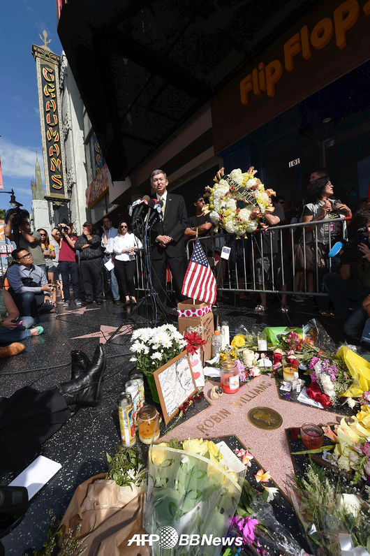 [OSEN=사진팀] 할리우드 유명 배우 로빈 윌리엄스가 향년 63세의 나이로 사망한 가운데 12일(현지시간) 미국 캘리포니아 할리우드에서 수많은 시민들이 애도를 하고 있다.