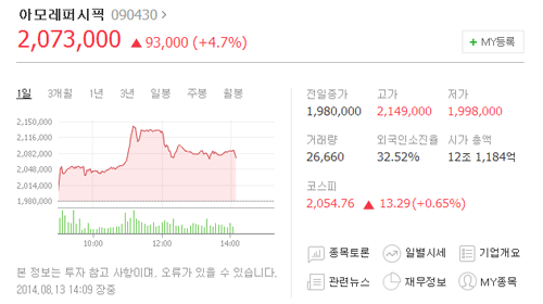 13일 오전 아모레퍼시픽은 장 시작과 동시에 급격히 올라 오후 2시가 넘은 현재 전일에 비해 9만 3000원(4.73%) 오른 207만 3000원을 기록하고 있다.
