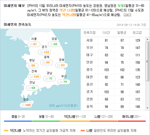 13일 에어코리아에 따르면 우리나라 미세먼지(PM10) 농도는 강원권, 영남권은 ‘보통’(일평균 31~80㎍/㎥), 그 밖의 권역은 ‘약간 나쁨’(일평균 81~120)으로 예상된다. 또한 수도권 미세먼지(PM2.5) 농도는 ‘약간나쁨’(일평균 41~65㎍/㎥)으로 예상된다.
