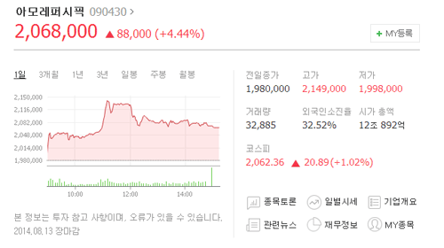 13일 오전 아모레퍼시픽의 주가는 장 시작과 동시에 급격히 올라 오후 3시에 장이 종료된 가운데 전날에 비해 8만 8000원(4.44%) 오른 206만 8000원이 됐다. 아모레퍼시픽 주가는 이날 한때 214만 9000원까지 치솟았으나, 오후 들어 다시 내려오며 현재 주가에서 장이 닫혔다.