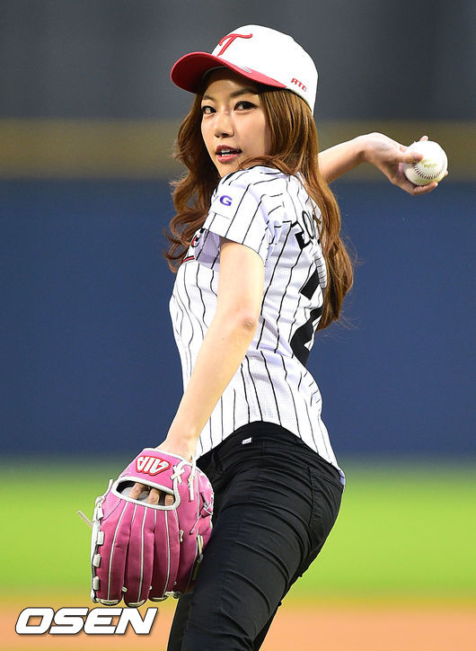 [0SEN=잠실,박준형 기자] 13일 오후 서울 잠실구장에성 열린 2014 한국야쿠르트 세븐 LG 트윈스와 SK 와이번스의 경기에 앞서 가수 레이디제인이 시구를 하고 있다.