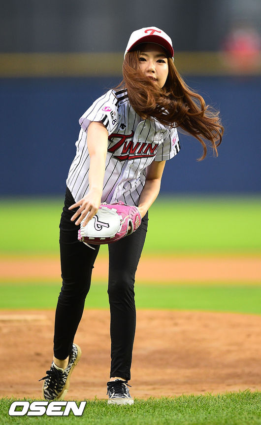 [0SEN=잠실,박준형 기자] 13일 오후 서울 잠실구장에성 열린 2014 한국야쿠르트 세븐 LG 트윈스와 SK 와이번스의 경기에 앞서 가수 레이디제인이 시구를 하고 있다.