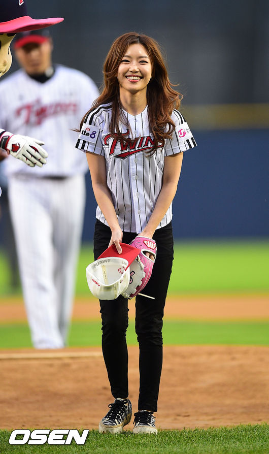 [0SEN=잠실,박준형 기자] 13일 오후 서울 잠실구장에성 열린 2014 한국야쿠르트 세븐 LG 트윈스와 SK 와이번스의 경기에 앞서 가수 레이디제인이 시구를 하고 미소 짓고 있다.