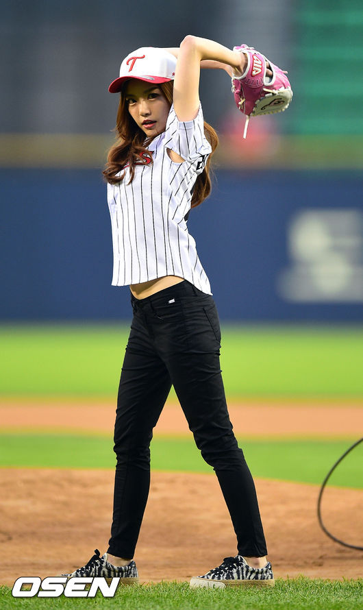 [0SEN=잠실,박준형 기자] 13일 오후 서울 잠실구장에성 열린 2014 한국야쿠르트 세븐 LG 트윈스와 SK 와이번스의 경기에 앞서 가수 레이디제인이 시구를 하고 있다.