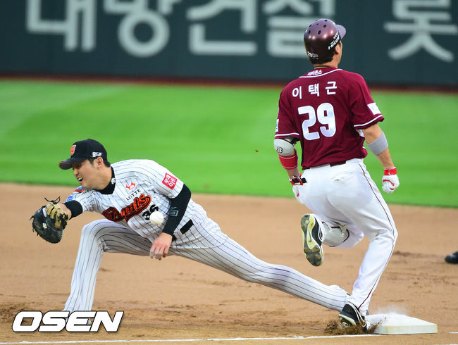 1회초 1사 주자없는상황에서 넥센 이택근이 3루수 실책으로 1루로 출루하고 있다.