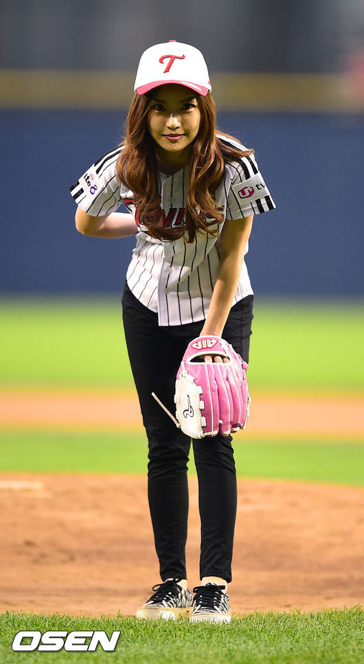 [0SEN=잠실,박준형 기자] 13일 오후 서울 잠실구장에성 열린 2014 한국야쿠르트 세븐 LG 트윈스와 SK 와이번스의 경기에 앞서 가수 레이디제인이 시구를 하고 있다.
