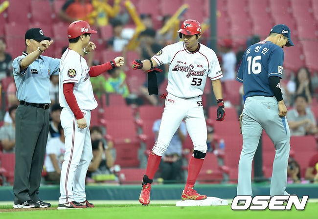 1회초 무사 1루에서 KIA 이대형이 우중간 적시 3루타를 치고 김종국 코치와 하이파이브를 하고 있다.