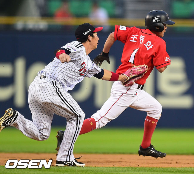 [0SEN=잠실,박준형 기자] 13일 오후 서울 잠실구장에서 열린 2014 한국야쿠르트 세븐 LG 트윈스와 SK 와이번스의 경기, 1회초 무사 2,3루 SK 최정의 내야땅볼때 2루 주자 조동화가 협살에 걸려 태그아웃되고 있다. 3루 주자 김재현을 선취득점.