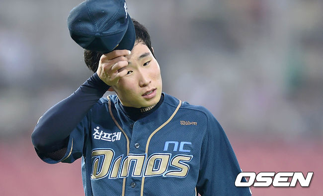 2회말 1사 1루에서 NC 이재학이 KIA 이성우를 병살타로 처리하고 더그아웃으로 가며 땀을 닦고 있다.