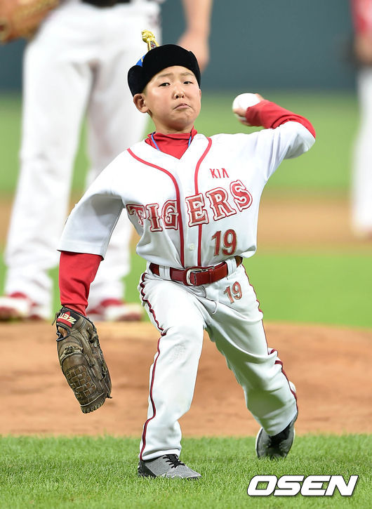 경기에 앞서 ‘타이거즈 러브펀드 데이’를 맞아 몽골 야구동아리의 투수 돌고스렌 테물렝군이 몽골 전통 모자를 쓰고 시구를 하고 있다.